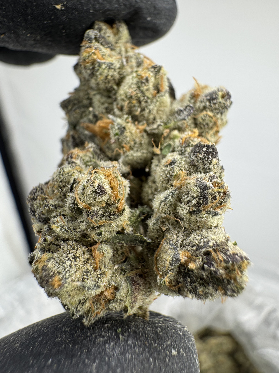 Medium-sized, dense, and frosty green buds adorned with deep purple hues and vibrant orange hairs. Looks as stunning as it smells—an absolute showstopper for your stash. 💎🌈